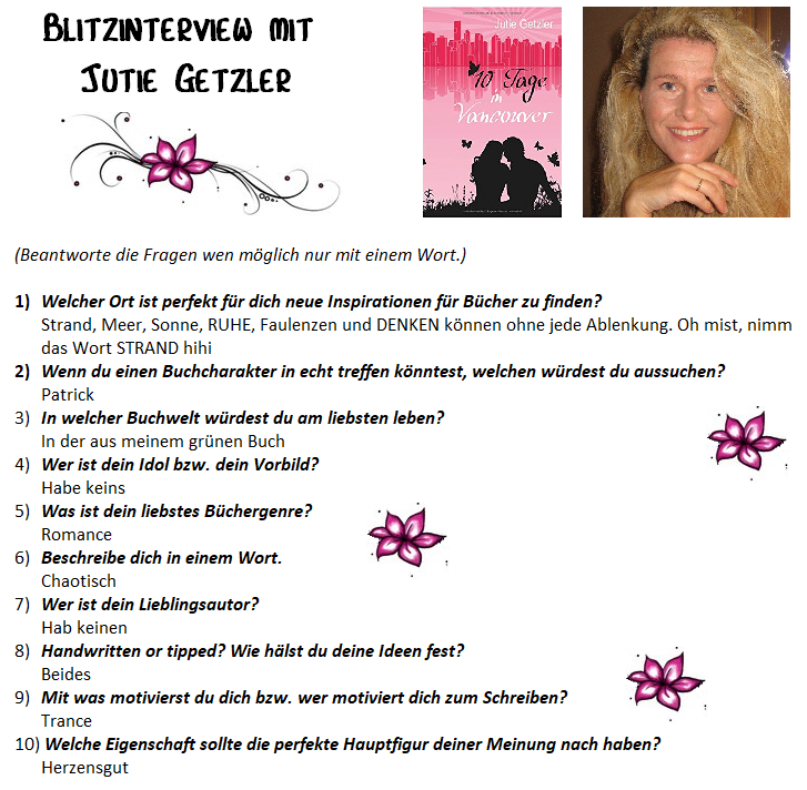 Das war mein Beitrag zum Autorentag mit Jutie Getzler. Ich hoffe ich konnte euch die liebe Jutie als Autorin sowie ihr Buch näher ans Herz legen und ich wünsche euch viel Freude mit Lara sowie 10 Tag in Vancouver!